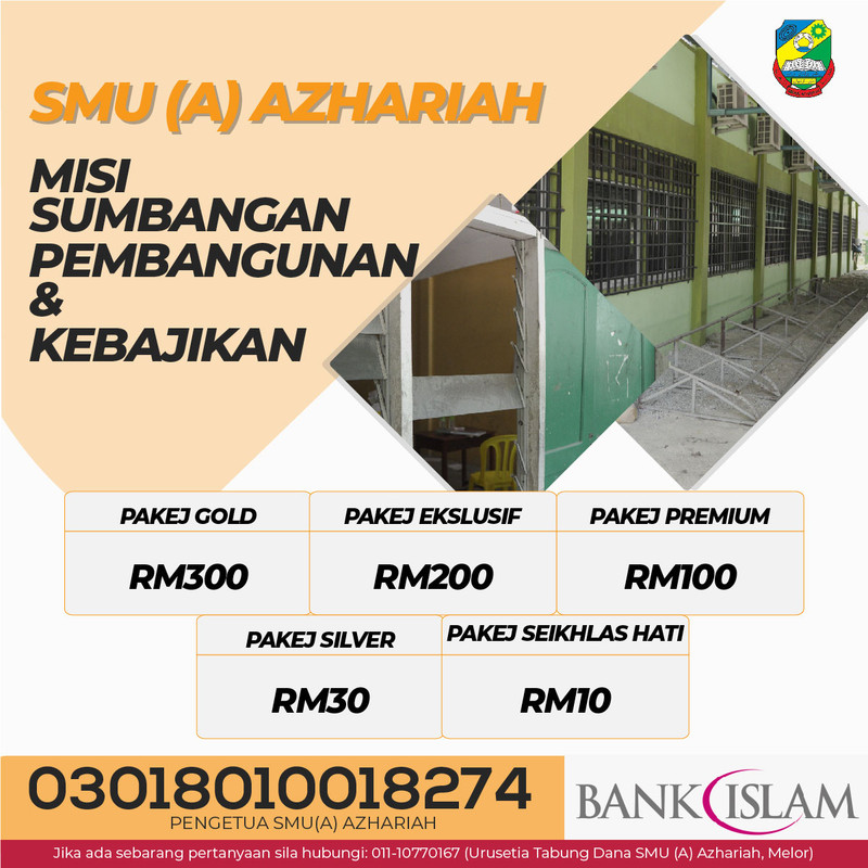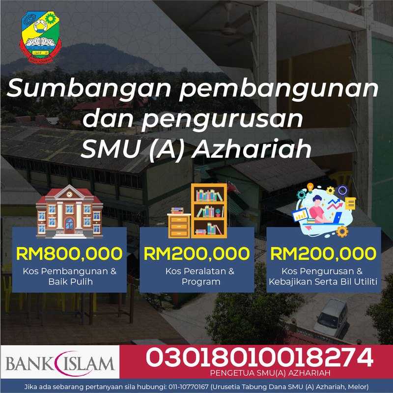 Bagi menjayakan projek pembangunan dan kos keperluan fasiliti di SMU(A) AZHARIAH, pihak kami memerlukan sekurang-kurangnya RM50,000 sebulan dan anggaran kos keseluruhan adalah sebanyak RM 1.2 juta .